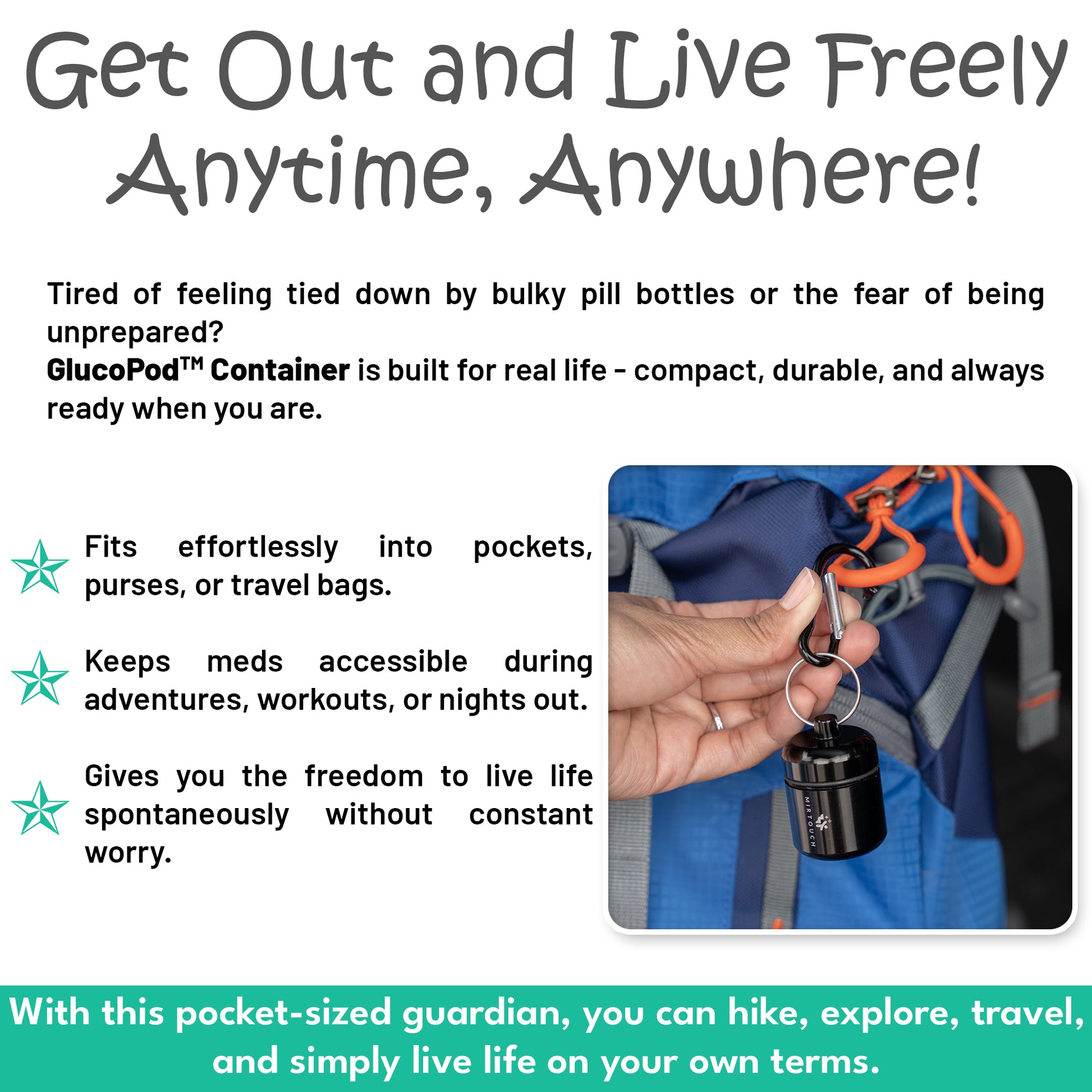 Tired of feeling tied down by bulky pill bottles or the fear of being unprepared? MirTouch GlucoPod™ Tablet Container is built for real life — compact, durable, and always ready when you need it.